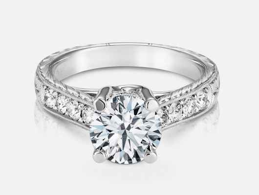 18K WG diamond in shank engagement setting set w/ 8-0.37 Cts G-H SI2 side stones w/ a 5.8 mm CZ Center.