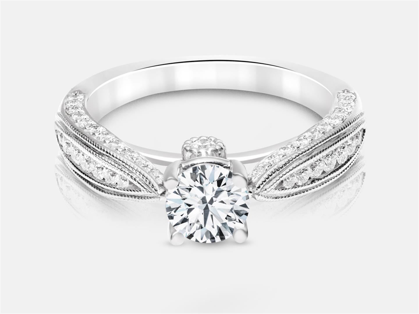 18K WG diamond in shank engagement setting set w/ 60-0.59 Cts G-H SI2 side stones w/ a 5.8 mm CZ Center.