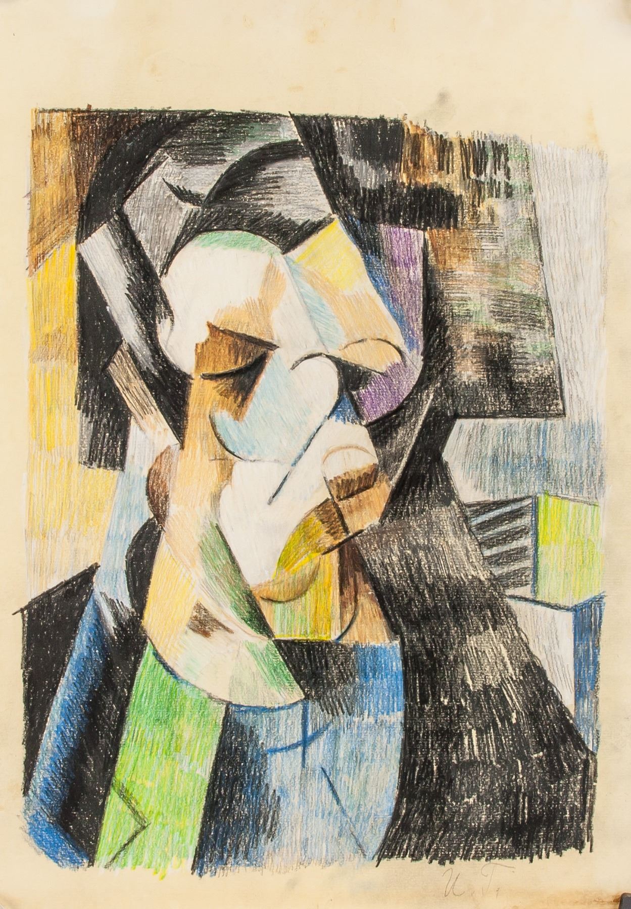 Pastel on paper, Cubist portrait of man. Signed by artist on lower right corner. 16.5 x 11.8 inch (42 x 30 cm).