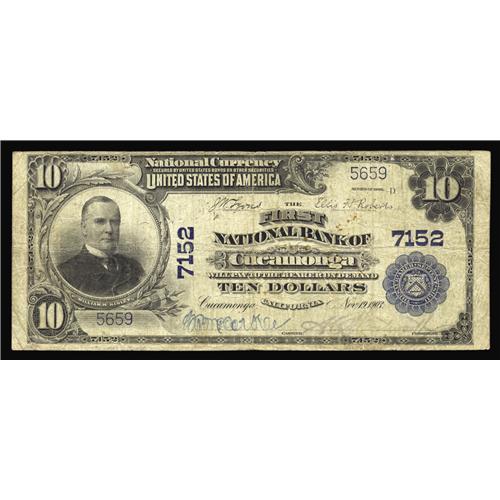 <B>Cucamonga, CA</B></I> - $10 1902 Plain Back Fr. 624 <B>The First NB</B></I> Ch. # 7152<BR>Any note from this one bank community is highly sought after, but large examples from here are just plain rare, with the new Kelly census showing just five such specimens. This is one of that small number. Many of the finest collections of California notes ever assembled, such as Horwedel and High Desert, have lacked a large note from this community, and any offering of such a note always draws a crowd of interested bidders. Expect this <B>Fine</B></I> example to easily reach and perhaps well exceed...