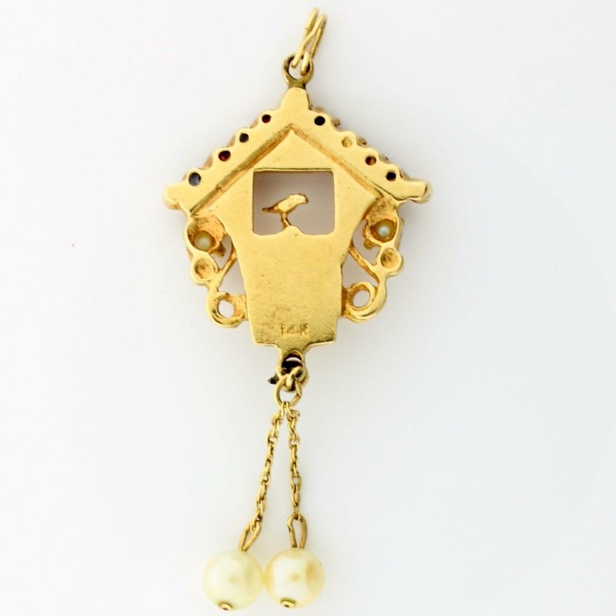 In 14K yellow gold, there are four 2.5mm round rubies, four 2.5mm round sapphires, two 3.2mm and two 5.5mm pearls. This pendant is 2 inches long. 5.4g