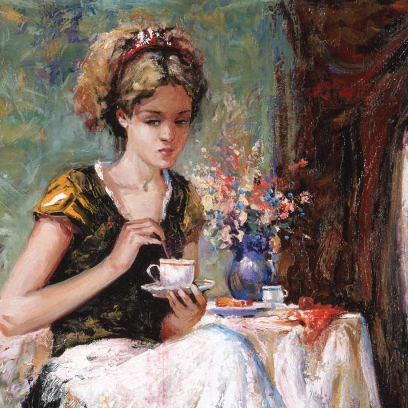 "Cue of Tea" is a limited edition Giclee on Canvas by Igor Semeko. The piece is numbered, hand siged by the artist, and come with a letter of authenticity. Measures approximately 30" x 24".