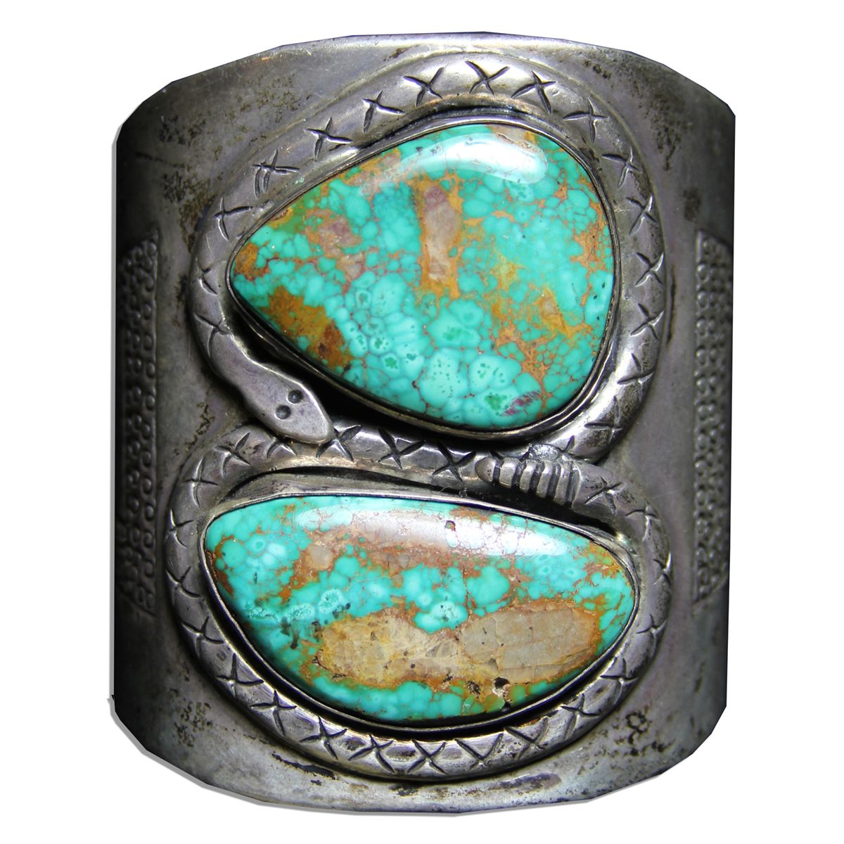 Cuff bracelet owned and worn by Arthur Ashe. Southwestern-style metallic bracelet features an engraved trapezoid design on each side. The top features an engraving of a snake in the shape of a figure-eight surrounding two large stones, aqua and yellow in color. Cuff is 3'' at the widest point in the middle, tapering to 1.75'' in diameter at the edges. Metal shows slight tarnish, otherwise very good condition. With an LOA from Ashe's widow.