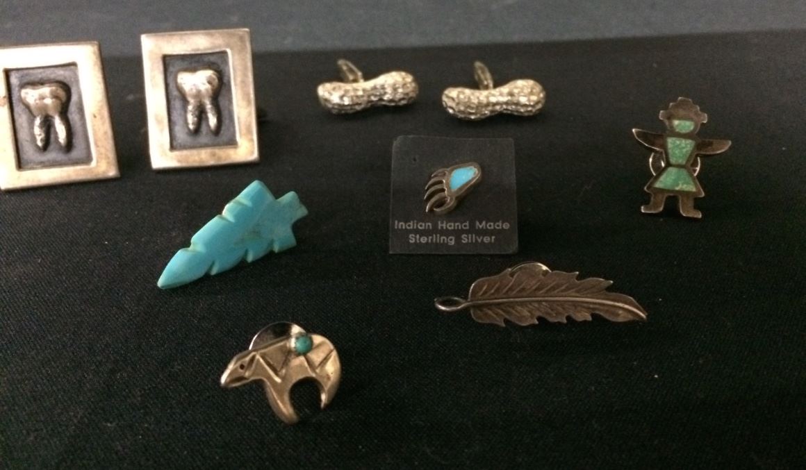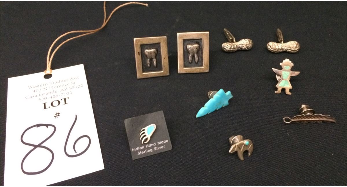 There are 2 pair of cufflinks (sterling) and 5 different tie tacks / hat pins (also sterling where applicable) all for one money in this lot! Collectively they weigh 68g. (including turq. and card). Good vintage condition. Shipping: There will be a $5 handling / packaging fee for shipping this lot. The actual cost of postage will be added on top of that.