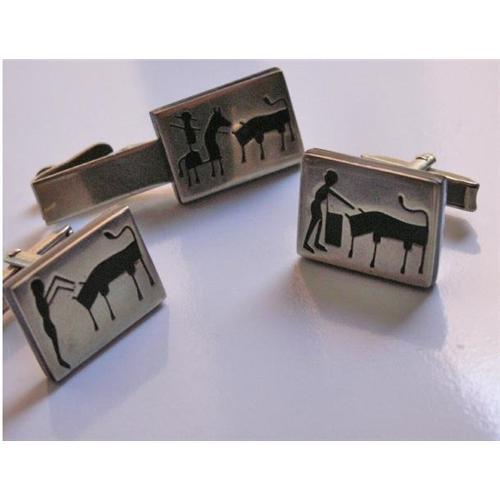 MADOURA TOROS <p>Wow! Mexican hand-crafted Alpaca (not sterling) cuff links. Beautiful and most unusual.<p>These are ever so attractive and perfect for either sex. The artistry is very unique Nielloware. The three pieces display a different image as if you are viewing a a bull fight. The Matador is on the horse, in the area and face to face with the bull. Hallmark on the cuff link toggle states alpaca. There is a stamped hallmark that reads: Made In Mexico. I am not sure if the backs are alpaca only or the entire set. Condition is perfect and the silver alpaca is shiny.<p>Measurement: 1-3/4" L x 5/8" W. Circa: Pre-Eagle.