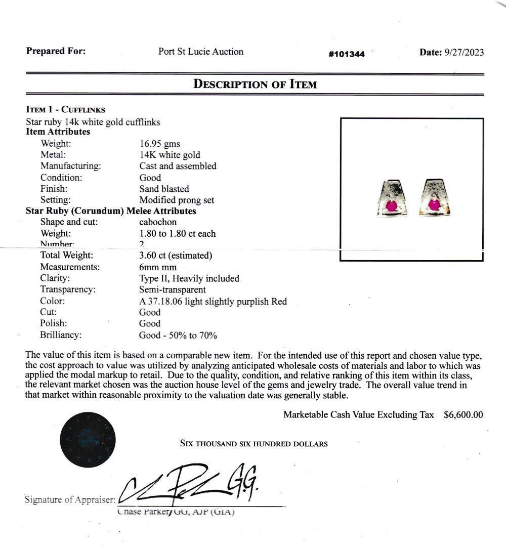 APPRAISAL REPORT: These cufflinks are certified and appraised for $6,600.00 estimated retail replacement value, according to Flawless GemLab.