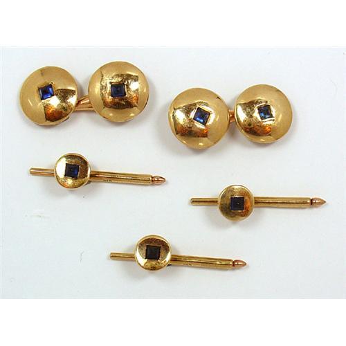 Austrian 14Kt pink gold cufflinks and stud dress set. The cufflinks and the three matching studs have an unusual cut bullet shaped natural sapphire. They are marked with the Austro-Hungarian 1920 to 1930 hallmark. The cufflinks are 9/16" (14mm) in diameter and the studs are 3/8" (8mm). The bar of the stud is 2.25" (3cm) long. It is in excellent condition.