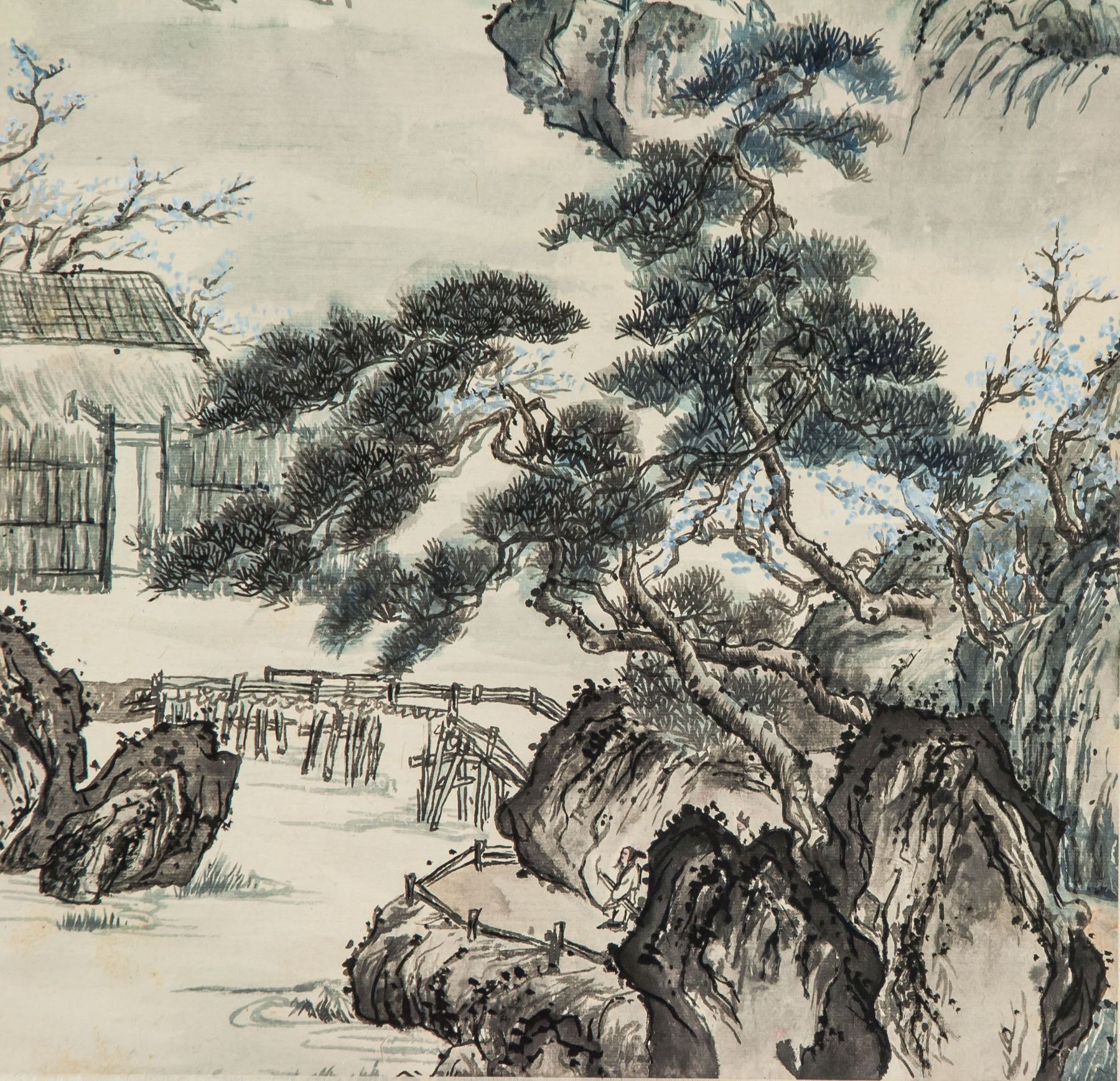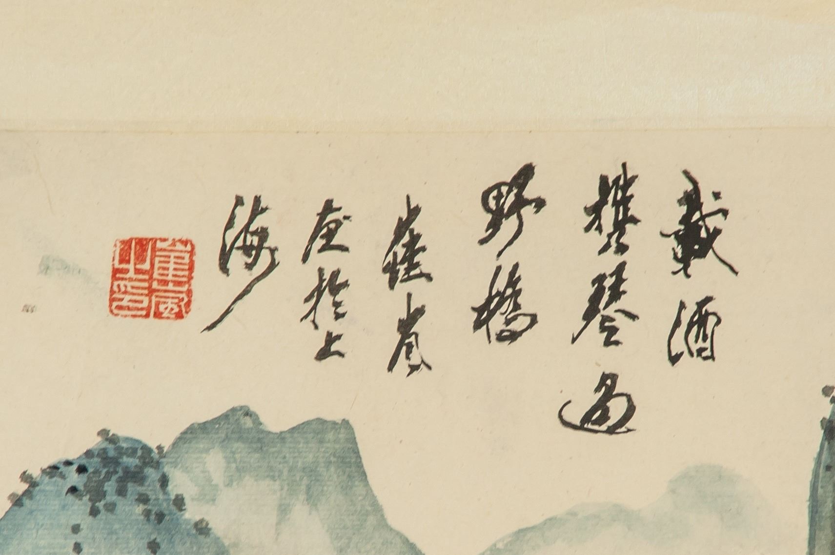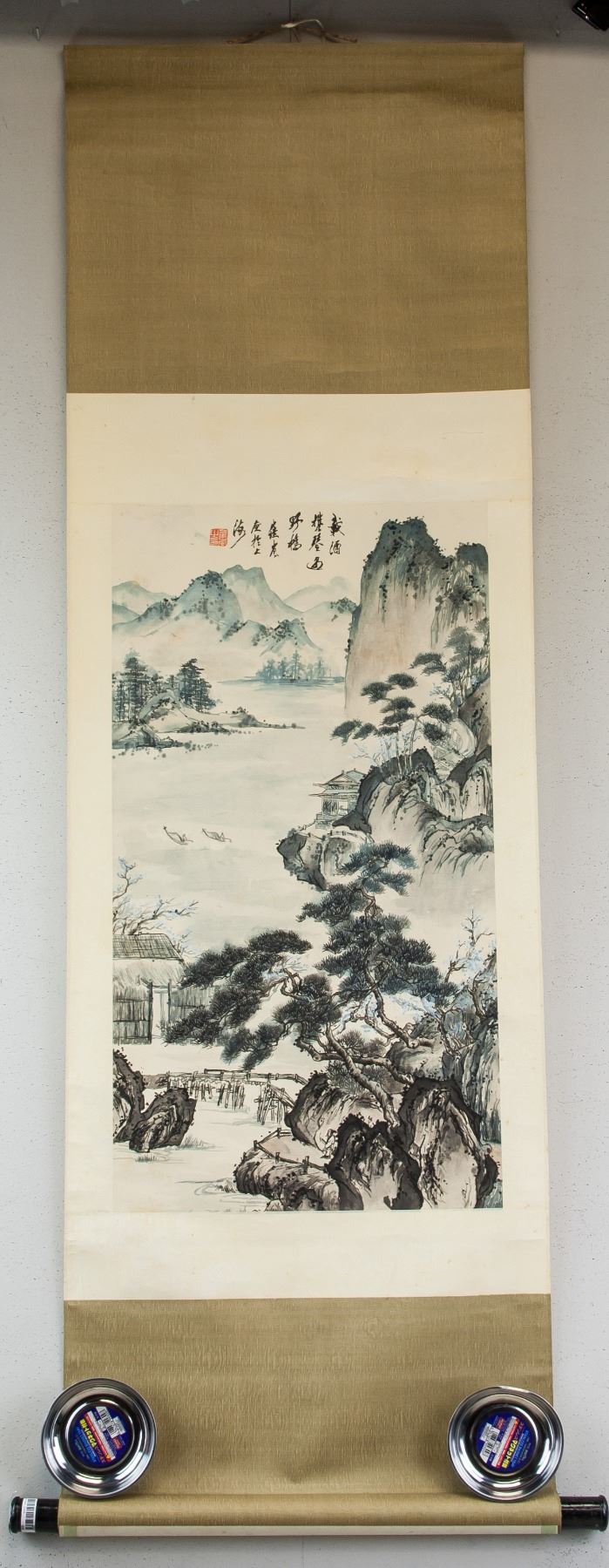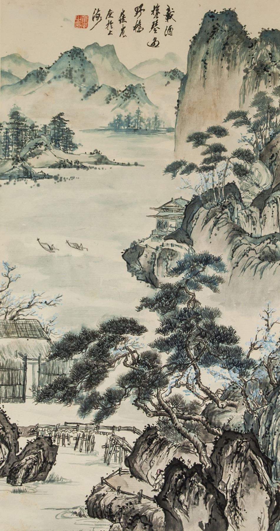 Ink and watercolor on paper, hanging scroll. Featuring a landscape scene. Signed Cui Lan b.1979 Chinese, inscribed with one artist seal. 69 x 37 cm