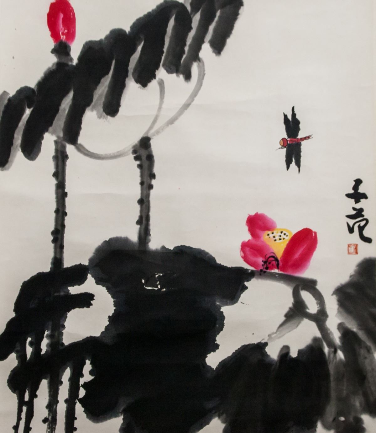 Ink and watercolor on paper, hanging scroll. Featuring lotus and dragonfly. Signed Cui Zifan (1915-2011, Chinese), inscribed with 1 artist seal. 59 x 205.74