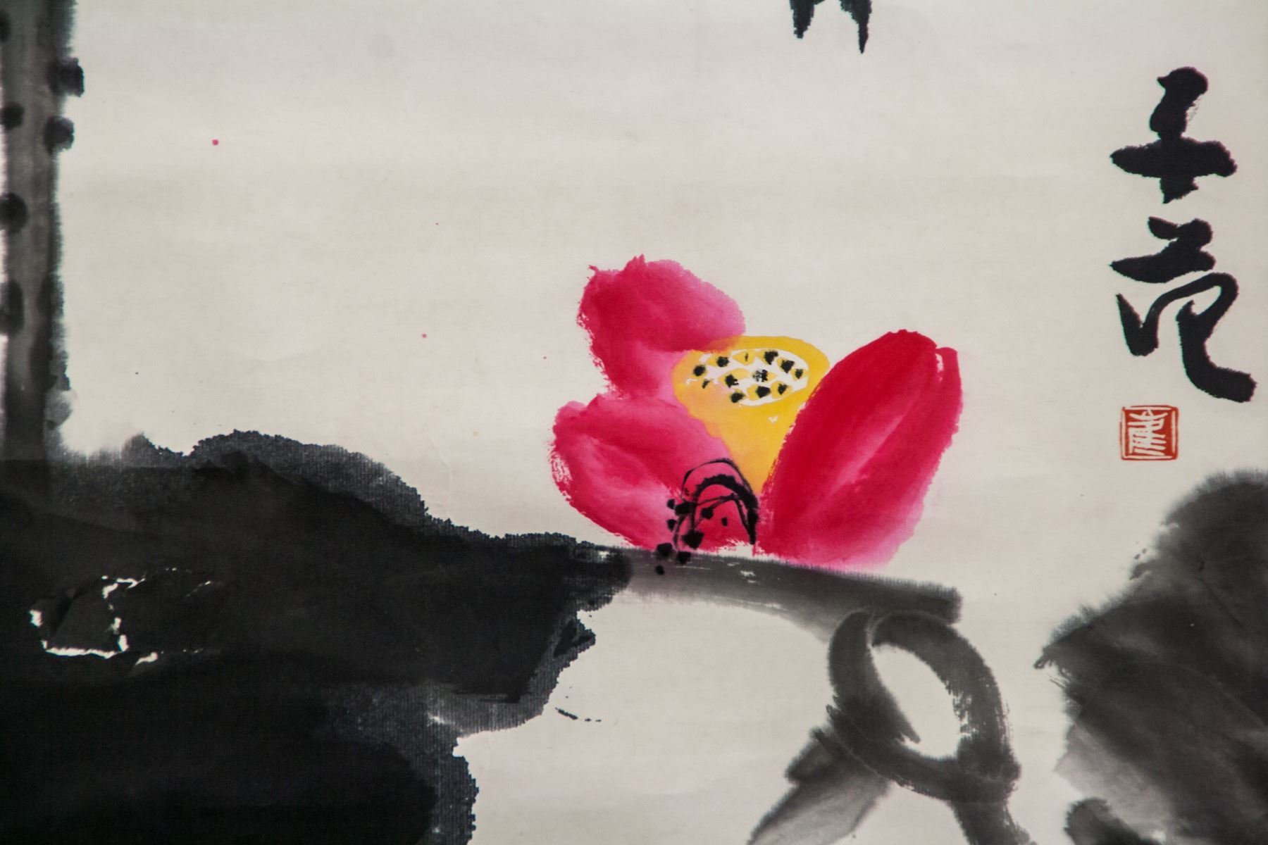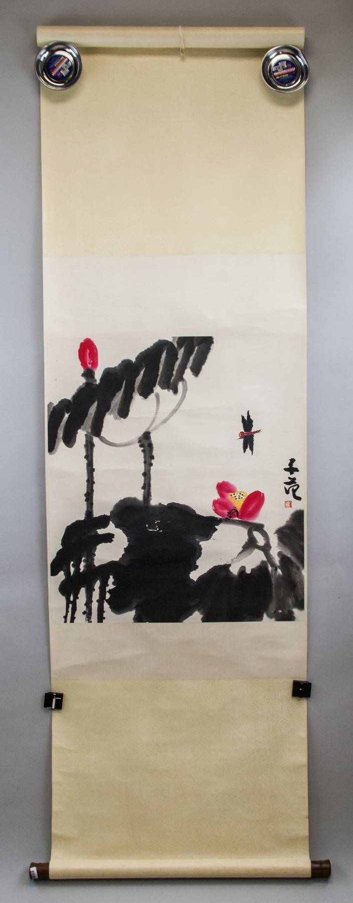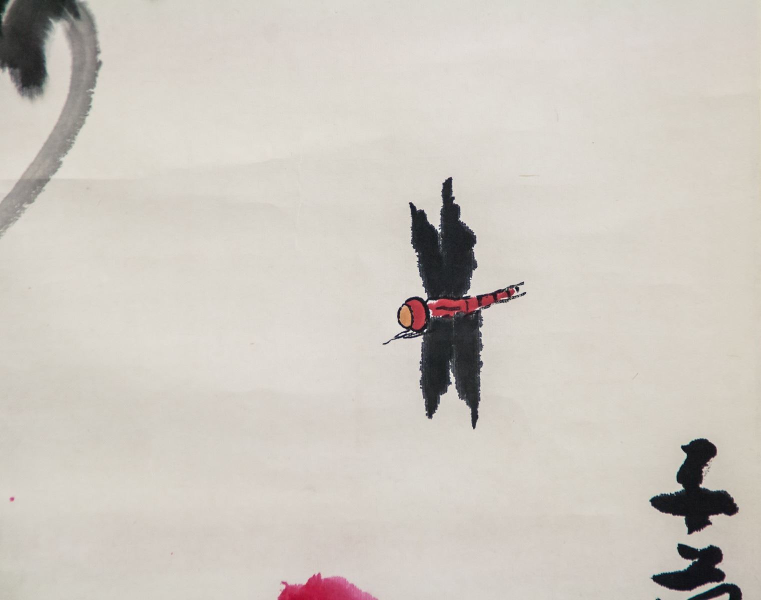 Ink and watercolor on paper, hanging scroll. Featuring lotus and dragonfly. Signed Cui Zifan (1915-2011, Chinese), inscribed with 1 artist seal. 59 x 205.74
