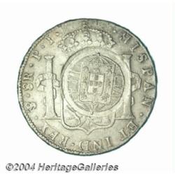Cuiaba. 960 Reis Decree of 1821, KM350, crowned 960 over C counterstamped on Bolivia 8 Reales 1808 of Carlos IIII. Very rare regional coinage. Toned AU counterstamp on XF host coin, an extremely attractive example with tremendous eye appeal.From the Morris Geiger Collection. Important notice: Heritage usually auctions material at the rate of 200-250 lots per hour. On some occasions eBay Live bid software or the Internet may not be able to keep up with the pace of the auction. We recommend placing a realistic absentee bid now as insurance to avoid disappointment. Occasionally the auctioneer may eliminate or reject an eBay Live bid, and the auctioneer may also reopen a lot after the close of the eBay live bidding (usually because we missed an audience bid), and may reject your bid even if it shows you as the winning bidder. By bidding via eBay Live, you agree that Heritage may award the lot to another bidder at its sole discretion under the circumstances described above or any other reasonable circumstances. Also please note that all Heritage lots purchased through eBay Live carry a 20% Buyer's Premium. Please make sure you read the Terms and Conditions before you bid.