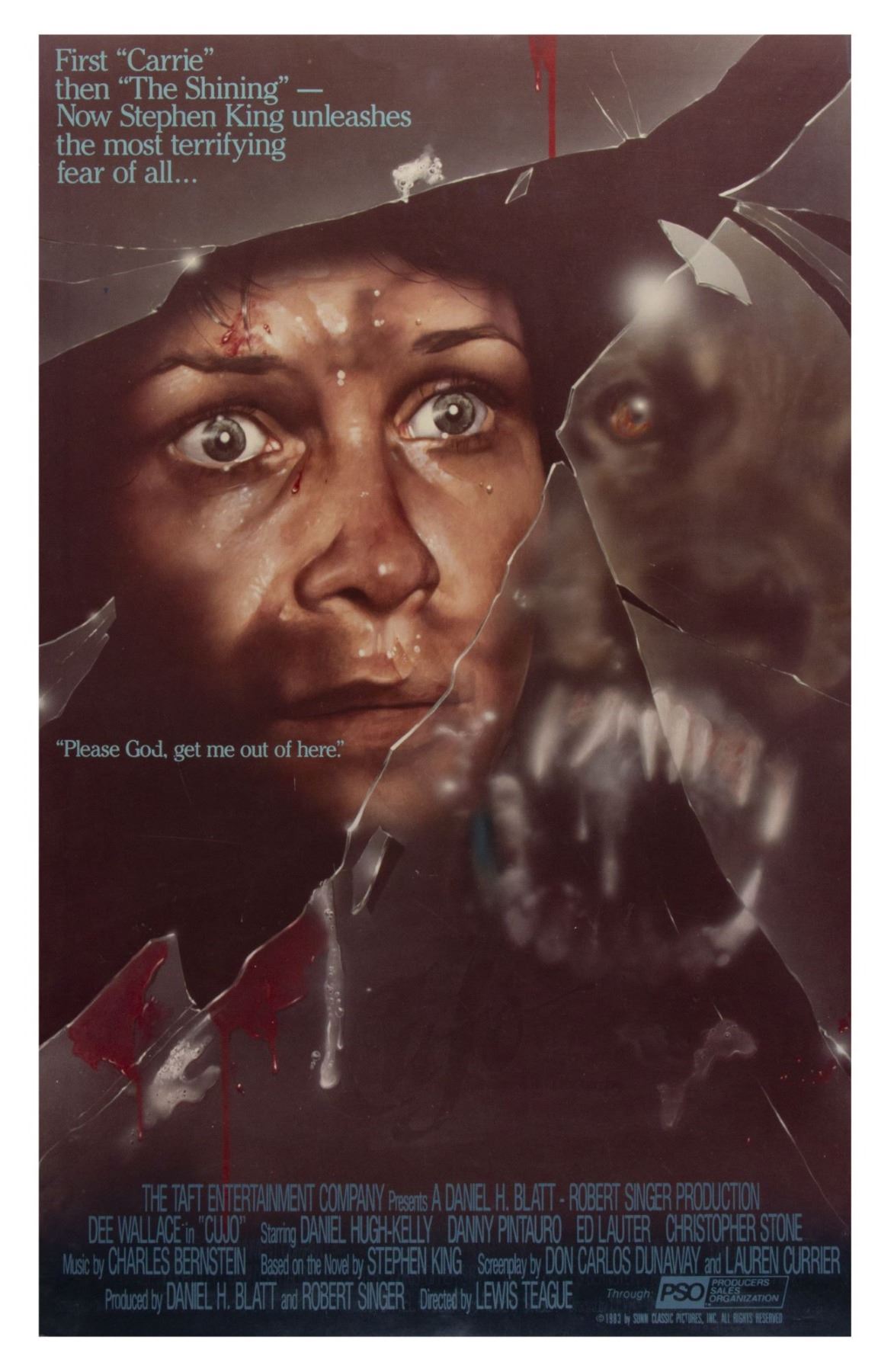 (Warner Bros, 1983) A rare and unique poster from the 1983 horror film "Cujo". This poster does not have its title displayed in large red font, allowing the striking imagery of this poster to be displayed unobscured. The poster measures 33"x21" and is adhered to foam core. The condition is fair to good, with some creasing and wear throughout, including some discoloration to the back of the foam core.
