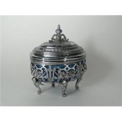 Fém, figurális lábakon ovális test áttört díszítéssel, kék színu üvegbetéttel, zsanérosan nyíló fedéllel, fogógombbal.