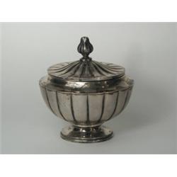 Ezüst 275 g, kerek talpon henger alakú bordázott test, leveheto fogógombos fedéllel, Jelzett magyar, 1935 utáni, SB mesterjeggyel