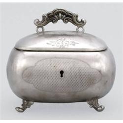 német, 19. sz. utolsó harmada, ezüst, "BN" mesterjegy, gilosált díszítéssel, négy öntött láb és fogó, belül aranyozott, kulcs hiányzik, 464,7 g; m: 12,5 cm