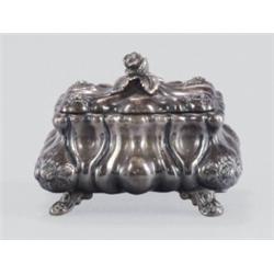 Pest, 1930 körül, ezüst, "KA" mesterjegy, trébelt hólyagos és rózsamintás díszítéssel, négy öntött lábon álló, belül aranyozva, 362,6 g; m: 10 cm