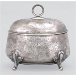 német, 19. sz. utolsó harmada, ezüst, vésett díszu, kerek fogóval, négy préselt lemez lábon, "JAK" monogramm vésettel, 251,5 g; m: 14 cm