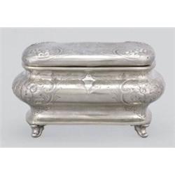 USA, 19. sz. utolsó harmada, ezüst, 800 -as fimomságjelzés, "H" és "Co" jelzés, 813 sorozatszámmal, domború forma, cizellált és vésett dísszel, négy öntött lábon, rátett utólagos címerpajzs,, 348,2 g; 10*15*8,5 cm, egykor aranyozva