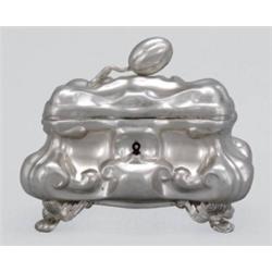 Bécs(?), 19. sz. közepe, antik ezüst, utólagos jegyekkel, "AK" mesterjegy, kagylós hólyagos díszítésu, négy préselt lábon, 331,8 g; m: 11 cm