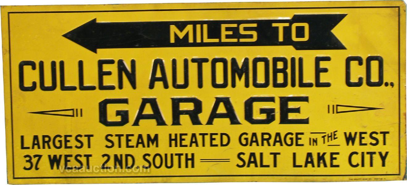 Cullen Automobile Co. "Garage" Embossed Tin Sign, Salt Lake City - 20" x 9"