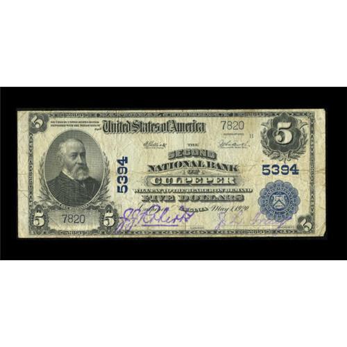 <B>Culpeper, VA</B></I> - $5 1902 Plain Back Fr. 607 <B>The Second NB</B></I> Ch. # 5394<BR> This bank has 10 large notes documented, not including this example. It has purple stamped signatures with the cashier's exhibiting particular boldness.<BR><I>From The Kansas City Collection.</B></I><BR><BR><b>Shipping:</b> Coins & Currency (<a target="_blank" href="http://www.heritageauctions.com/common/shipping.php">view shipping information</a>)