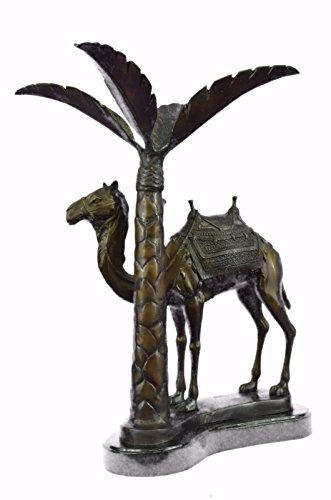 This Statue Is Of A Camel Who Stands Square, Resting For A Moment Under The Shade Of A Nearby Palm Tree. He Has A Saddle On His Back That Is Empty Of A Traveler, And He Waits Patiently For Their Return. The Saddle Is Decorated In Three Shades And Has Two Peg Handles To Hold Onto On Top, The Reigns Wrapped Around The Front One Hangs Loosely. The Face And Entire Piece Has Immaculate Detailing, From The Nostrils To The Dangling Tassels On The Saddle. The Palm Tree Is Texturized On The Trunk And Reaches Up To Open Leaves That Are A Silver Color And Match The Fabric On The Saddle. His Feet Rest Upon A Smooth Surface Of Bronze And Marble. This Bronze Sculpture Was Casted Using The Lost Wax Method And Has A Brown, Green And Gold Patina. Bronze Dimensions With Marble Base: Height 27 X Width 27 inches. Weight: 35 Lbs.Please Note: This is a reproduction bronze sculpture from the original molded and signed. This featured bronze sculpture is a recast after the original, and has been done recently. This 100% bronze sculpture is an abstract piece certain to be a conversation piece.Please Note: This is a reproduction bronze sculpture from the original molded and signed. This featured bronze sculpture is a recast after the original, and has been done recently. This 100% bronze sculpture is an abstract piece certain to be a conversation piece.