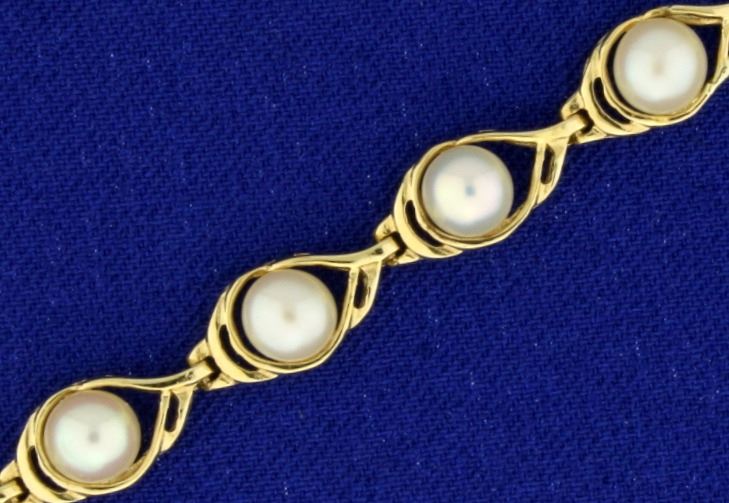 In 14k yellow gold. Contains fourteen 5mm pearls with excellent color and luster. 6mm thick, with lobster clasp. 7 3/4 inches long. 7.5g.