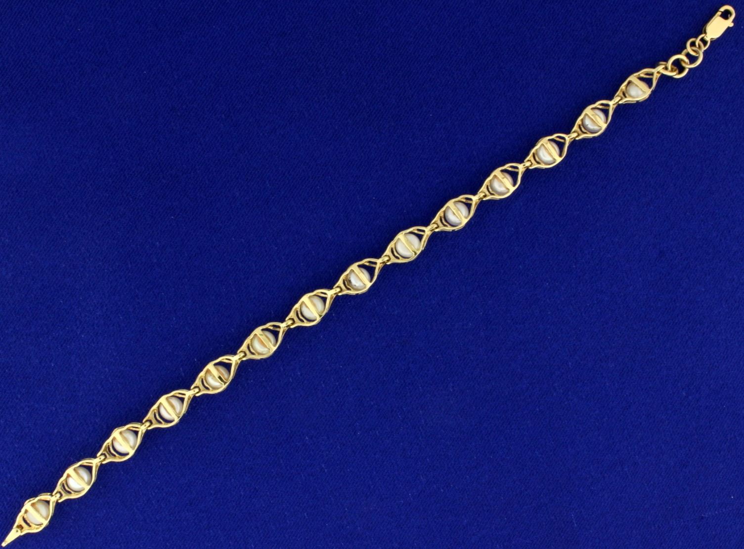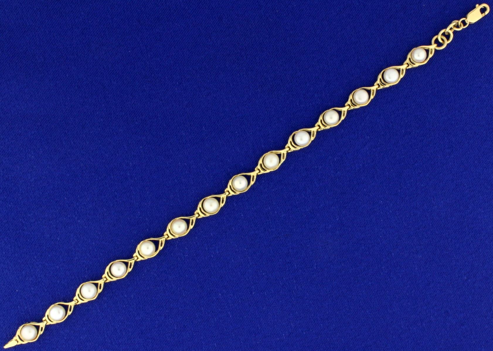 In 14k yellow gold. Contains fourteen 5mm pearls with excellent color and luster. 6mm thick, with lobster clasp. 7 3/4 inches long. 7.5g.