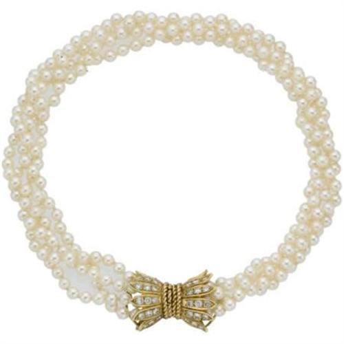 <B>Cultured Pearl, Diamond, Gold Necklace</B></I><BR><BR>The necklace is composed of cultured pearls measuring 4.50 - 4.00 mm, forming four knotted strands, completed by a clasp, designed as a tassle, enhanced by full-cut diamonds, set in 14k yellow gold. The necklace can be worn loosely or twisted into a torsade. Total diamond weight is approximately 1.80 carats. Gross weight 43.30 grams. <BR><I>Length: 14-1/2 inches</B></I> <B>Condition Report:</B> Good condition.<BR><BR><b>Shipping:</b> Miscellaneous Collectibles, Smal (<a target="_blank" href="http://www.heritageauctions.com/common/shipping.php">view shipping information</a>)