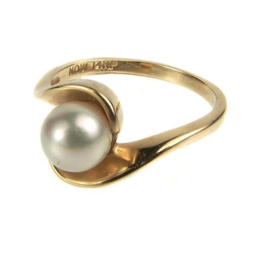A cultured pearl is centered in bands swirl. Has the letters "NOW 14KP" inscribed inside the band.