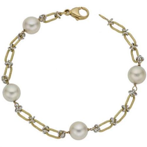 <B>Cultured Pearl, Gold Bracelet</B></I><BR><BR>The 18k white gold and yellow gold link bracelet features cultured pearls measuring approximately 8.00 - 8.50 mm, completed by a lobster clasp. Gross weight 8.00 grams. <BR><I>Length: 7-1/2 inches</B></I> <B>Condition Report:</B> Very good condition.<BR><BR><b>Shipping:</b> Miscellaneous Collectibles, Smal (<a target="_blank" href="http://www.heritageauctions.com/common/shipping.php">view shipping information</a>)