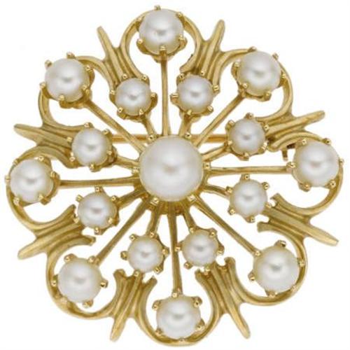 <B>Cultured Pearl, Gold Brooch</B></I><BR><BR>The brooch, designed as a starburst, features cultured pearls ranging in size from 2.50 - 3.00 mm to 5.00 - 5.50 mm, set in 14k yellow gold. A pinstem and catch complete the reverse. Gross weight 8.40 grams. <BR><I>Dimensions: 1-1/8 inches x 1-1/8 inches</B></I><BR><I>*The Property of Sharon Bush</B></I> <B>Condition Report:</B> Very good condition.<BR><BR><BR><b>Shipping:</b> Miscellaneous Collectibles, Smal (<a target="_blank" href="http://www.heritageauctions.com/common/shipping.php">view shipping information</a>)