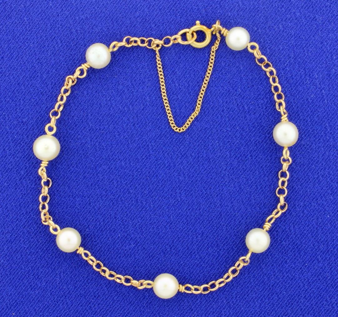We love this bracelet! 7 Cultured pearls measuring 5.75mm each are set between 18k yellow gold links in this 7" long chain. So finely made, it even includes a safety chain! 4.7g