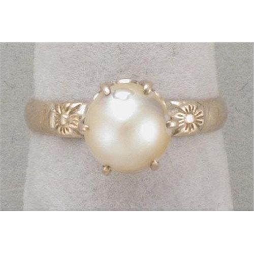 Cute 9K (unmarked, but tested) ring set with an approximately 7 1/2MM cultured pearl. (You can tell it's a genuine pearl as you can see the imperfections--the bumps in the nacre as shown in the photos.) It is a size 6 1/2 and weighs 2.0 grams.