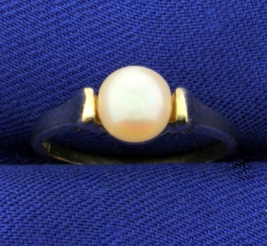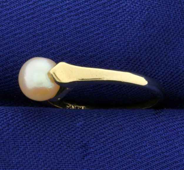 In 10k yellow gold. Contains a 6mm cultured pearl with excellent color and luster. Size 8. 2.3g.