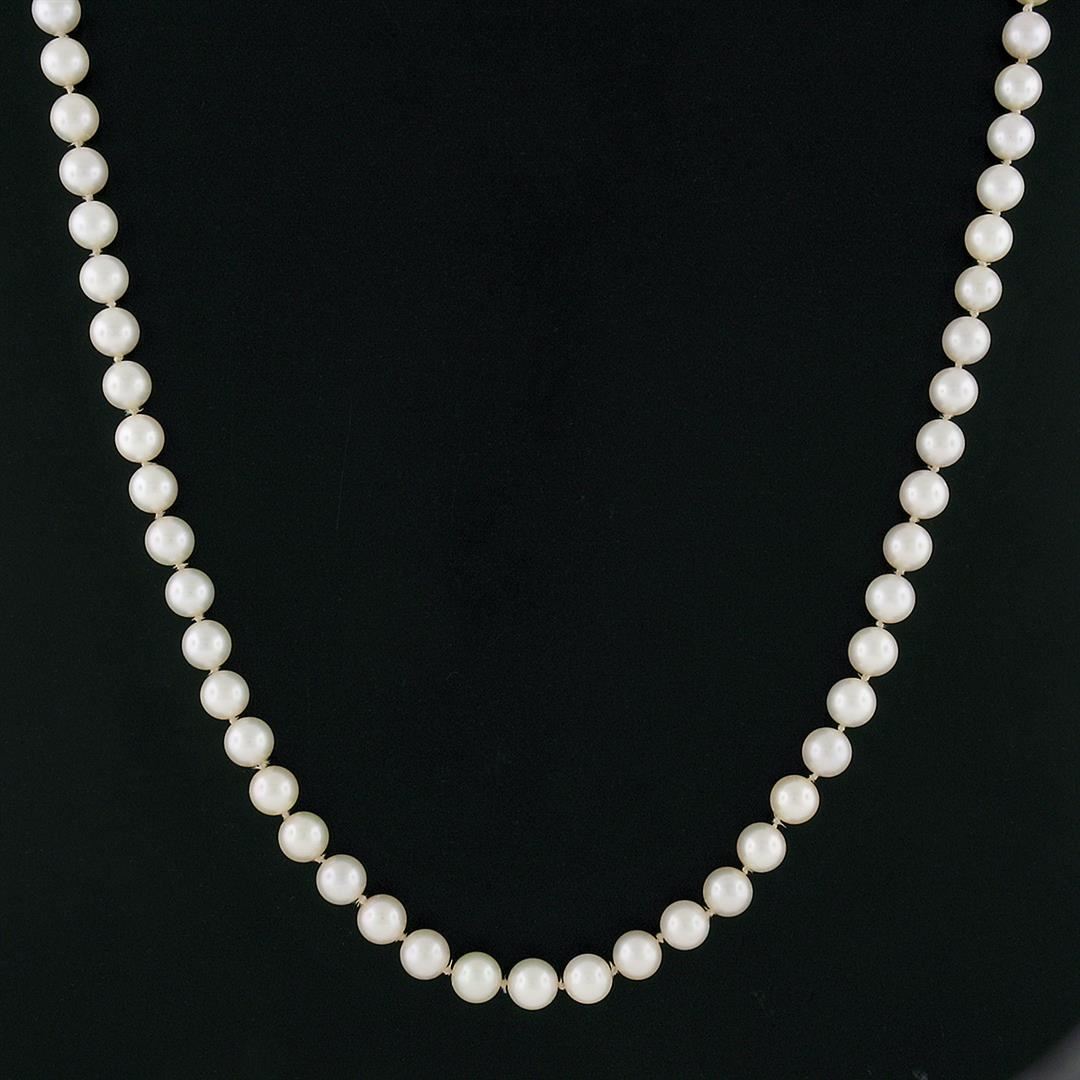 A strand necklace with solid 14k white gold cage clasp, featuring 57 round shape cultured pearls (7mm to 7.5mm each). Adjustable 18.5 inch strand link chain, 32.39 grams total weight, clasp thickness measures 9.80mm.