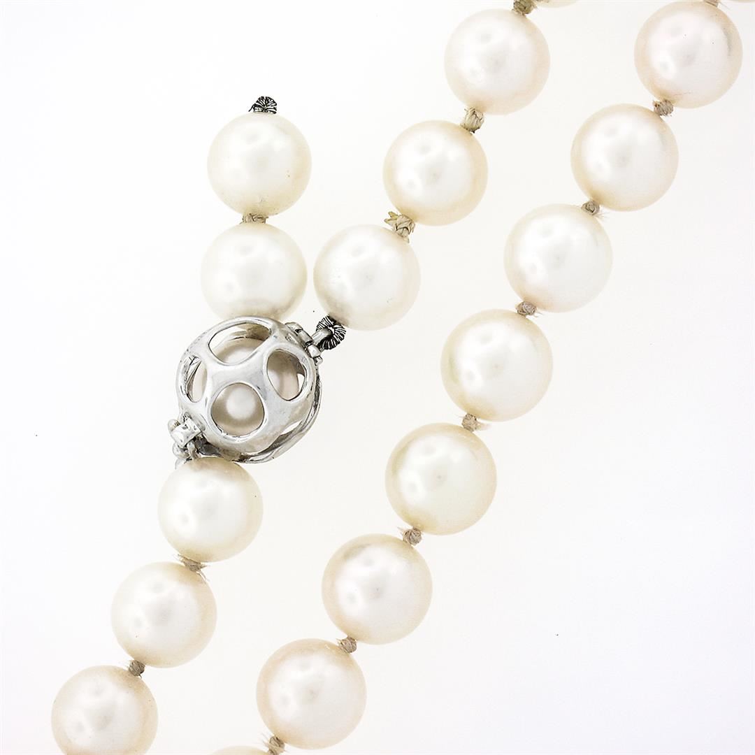 A strand necklace with solid 14k white gold cage clasp, featuring 57 round shape cultured pearls (7mm to 7.5mm each). Adjustable 18.5 inch strand link chain, 32.39 grams total weight, clasp thickness measures 9.80mm.