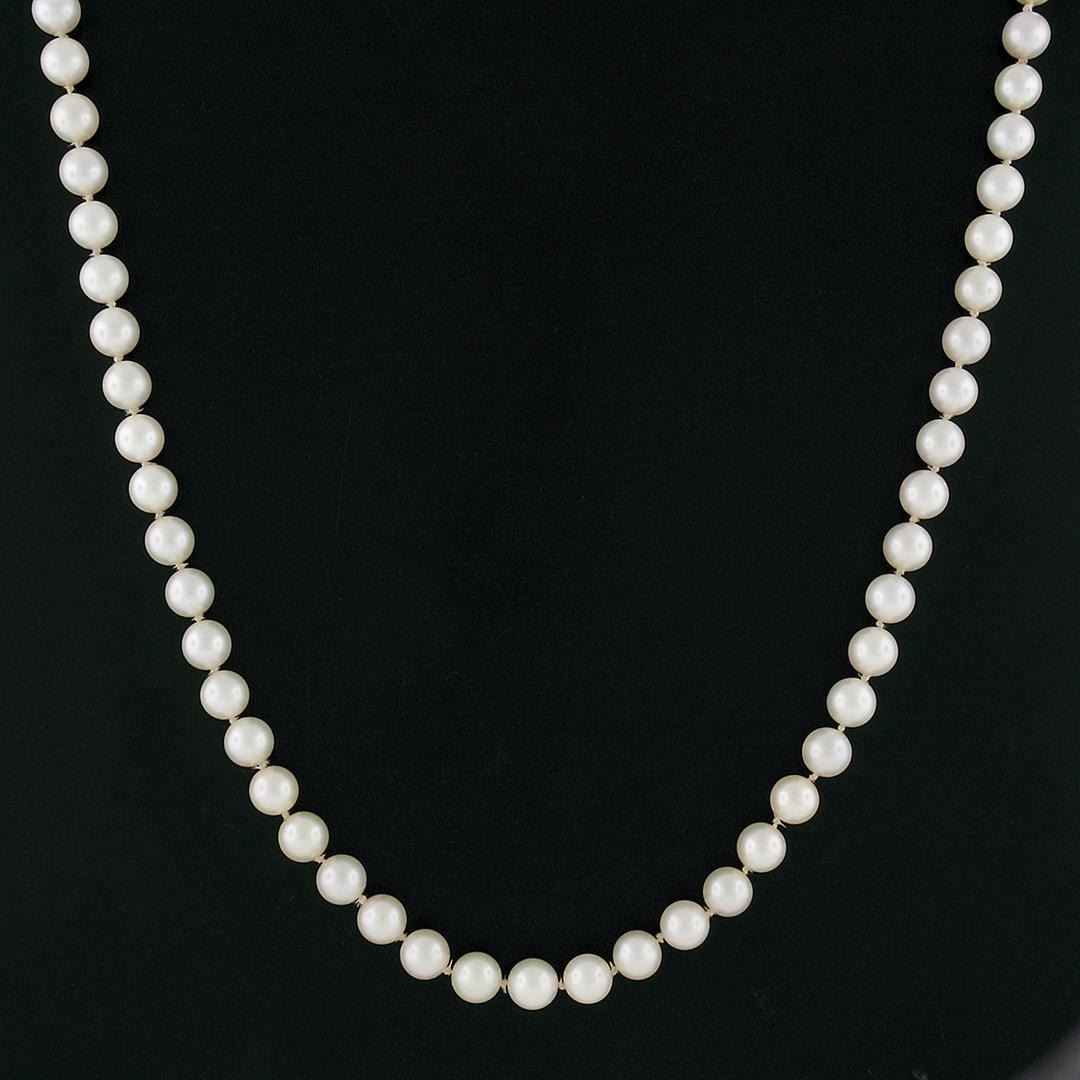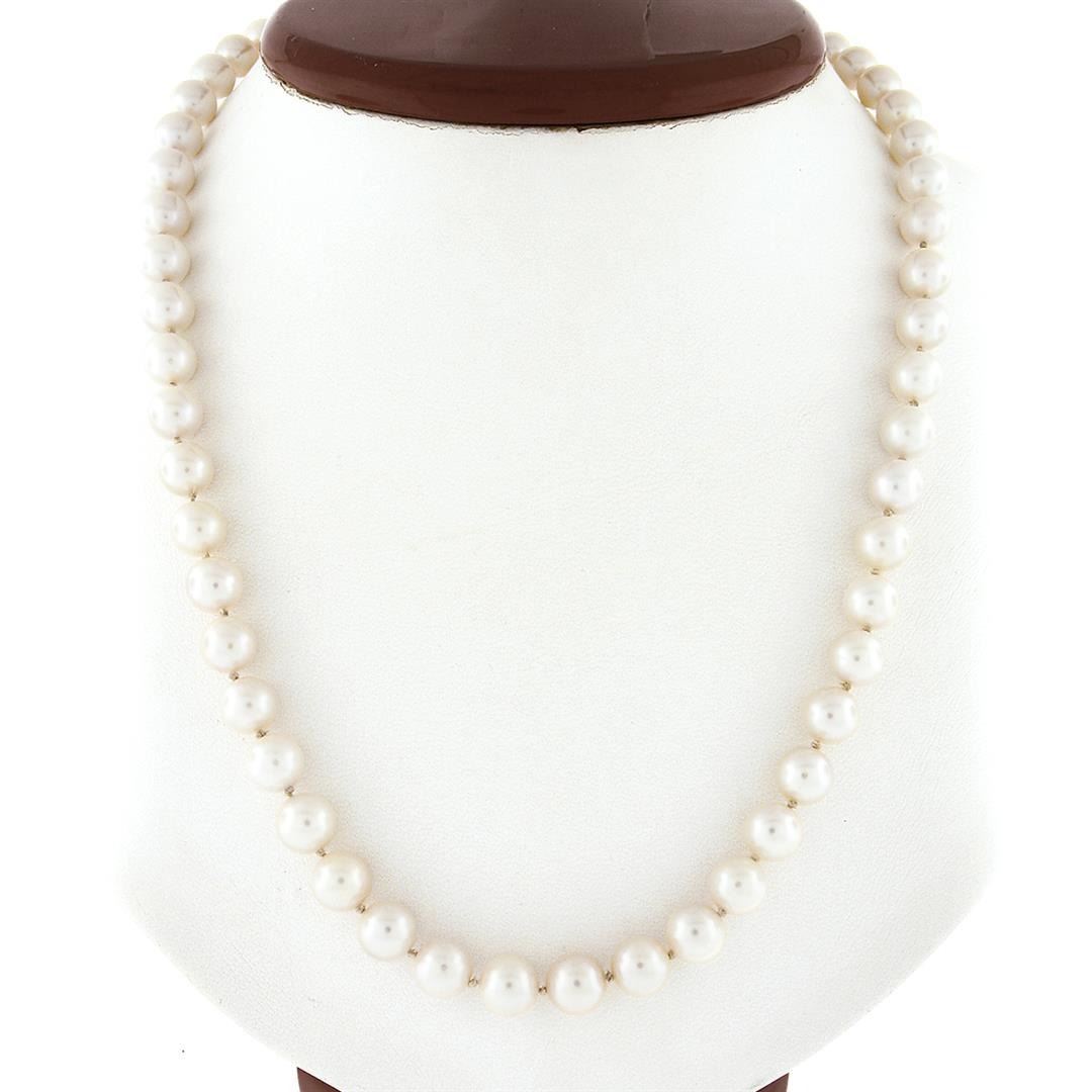A strand necklace with solid 14k white gold cage clasp, featuring 57 round shape cultured pearls (7mm to 7.5mm each). Adjustable 18.5 inch strand link chain, 32.39 grams total weight, clasp thickness measures 9.80mm.