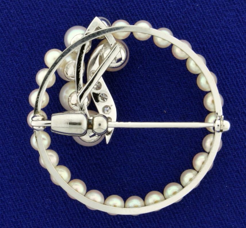 In 14k white gold. There are 24 pearls, 4mm each, in a circle design. Inside the circle, there are 6 pearls with the following measurements: 6.4mm, 5.7mm, 5.1mm, 4.9mm, 4.4mm, and 6.1mm. Pearls are high quality with excellent color and luster. Additionally, contains 5 high quality round cut brilliant diamonds, .13 carats total weight, H color/SI clarity. Pin measures 1 3/8 inch in diameter. 8.5g