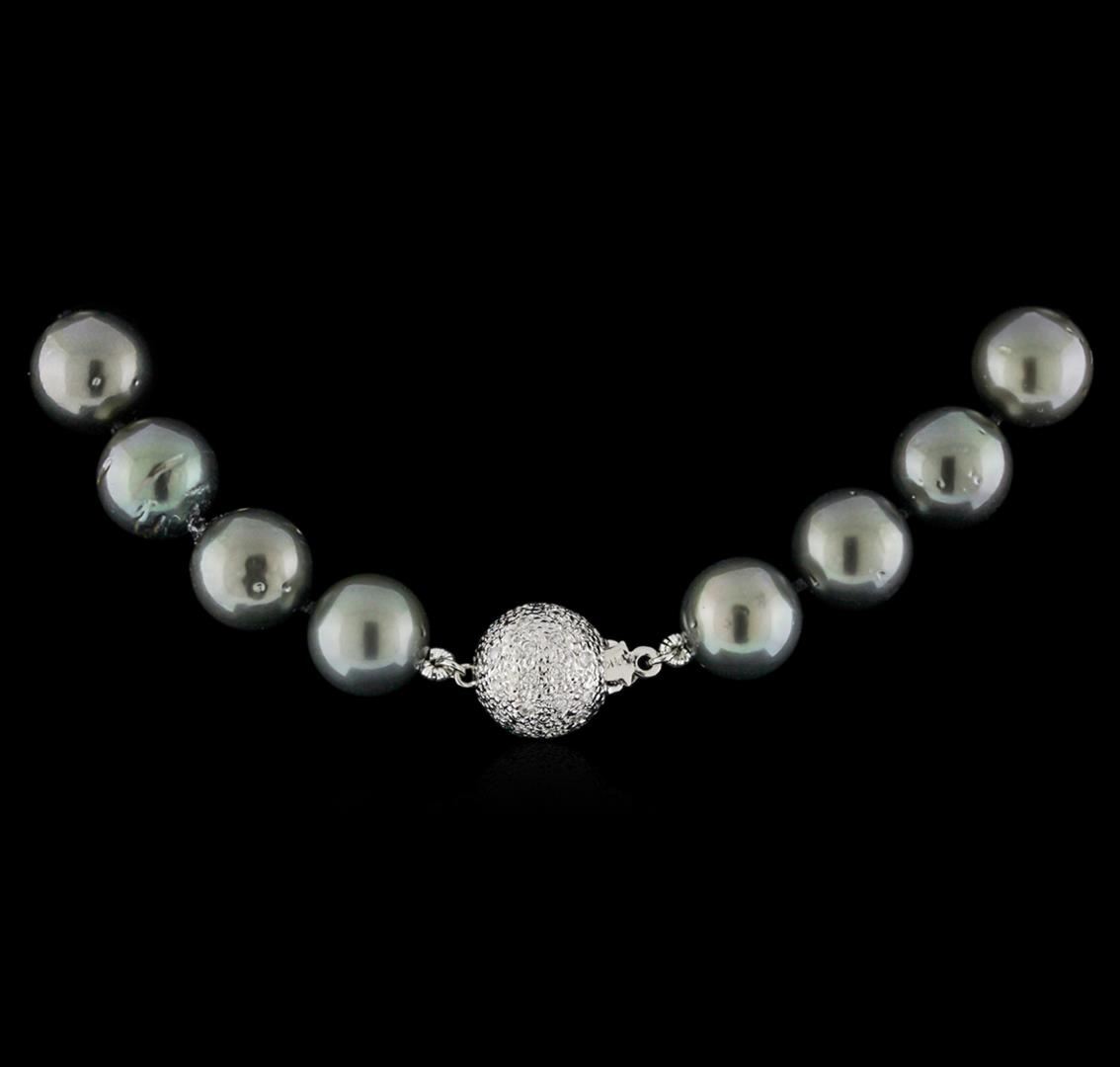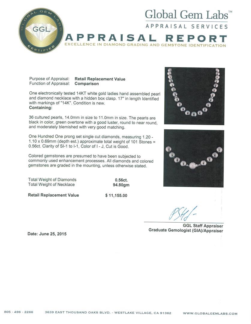 One electronically tested 14KT white gold ladies hand assembled pearl and diamond necklace with a hidden box clasp. 17" in length Identified with markings of "14K". Condition is new. Containing: 36 cultured pearls, 14.0mm in size to 11.0mm in size. The pearls are black in color, green overtone with a good luster, round to near round, and moderately blemished with very good matching. One Hundred One prong set single cut diamonds, measuring 1.20 - 1.10 x 0.69mm (depth est.) approximate total weight of 101 Stones = 0.56ct. Clarity: SI-1 to I-1. Color: I - J, Cut is Good. Colored gemstones are presumed to have been subjected to commonly used enhancement processes. All diamonds and colored gemstones are graded in the mounting, unless otherwise stated. Total Weight of Diamonds 0.56ct. Total Weight of Necklace 94.80 grams. GGL Appraised at $11,155.00.