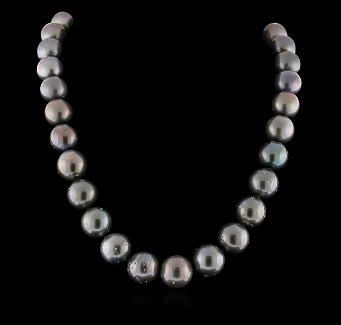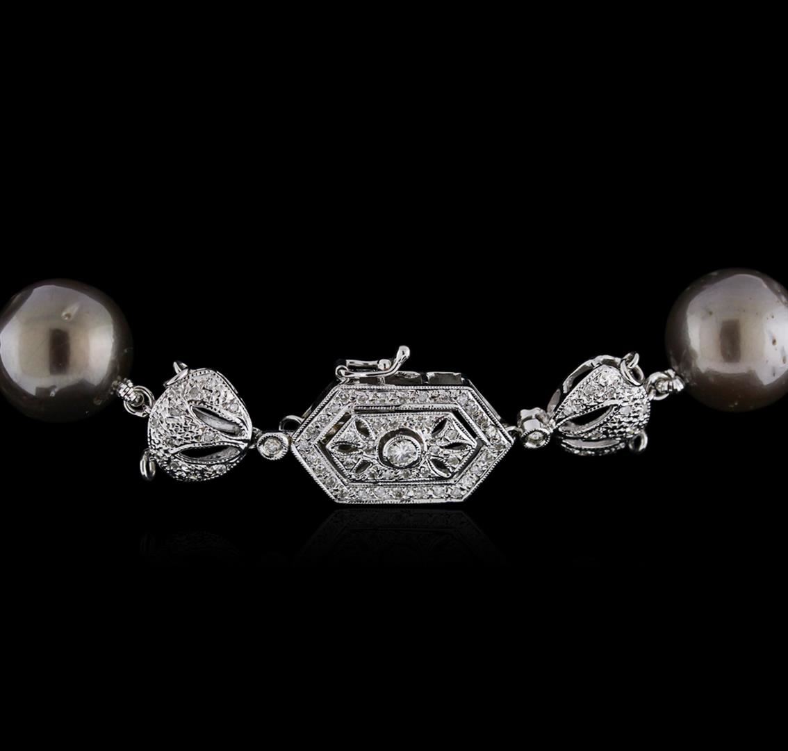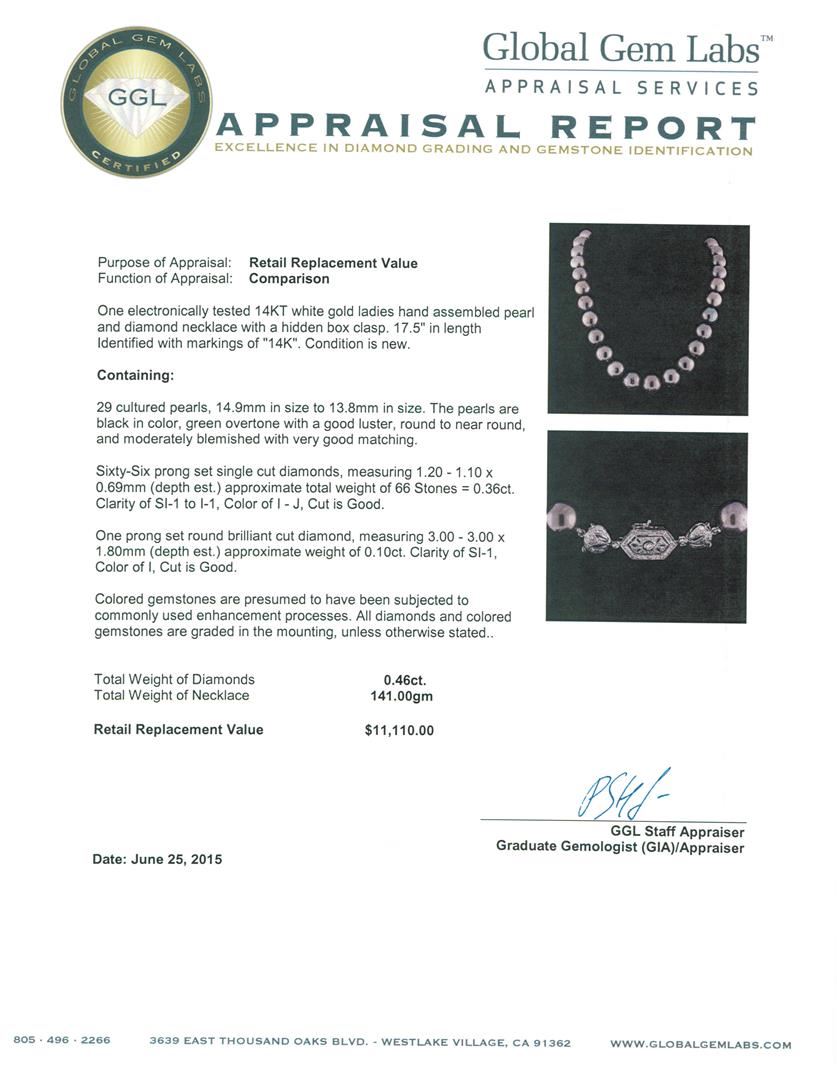 One electronically tested 14KT white gold ladies hand assembled pearl and diamond necklace with a hidden box clasp. 17.5" in length Identified with markings of "14K". Condition is new. Containing: 29 cultured pearls, 14.9mm in size to 13.8mm in size. The pearls are black in color, green overtone with a good luster, round to near round, and moderately blemished with very good matching. Sixty-Six prong set single cut diamonds, measuring 1.20 - 1.10 x 0.69mm (depth est.) approximate total weight of 66 Stones = 0.36ct. Clarity: SI-1 to I-1. Color: I - J, Cut is Good. One prong set round brilliant cut diamond, measuring 3.00 - 3.00 x 1.80mm (depth est.) approximate weight of 0.10ct. Clarity: SI-1. Color: I, Cut is Good. Colored gemstones are presumed to have been subjected to commonly used enhancement processes. All diamonds and colored gemstones are graded in the mounting, unless otherwise stated. Total Weight of Diamonds 0.46ct. Total Weight of Necklace 141.00 grams. GGL Appraised at $11,110.00.