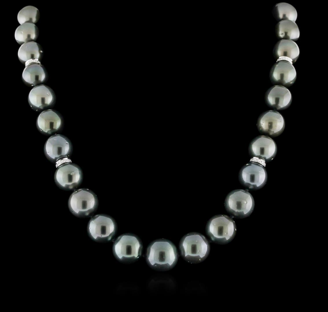 One electronically tested 14KT white gold ladies hand assembled pearl and diamond necklace with a hidden box clasp. 17" in length Identified with markings of "14K". Condition is new. Containing: 36 cultured pearls, 14.0mm in size to 11.0mm in size. The pearls are black in color, green overtone with a good luster, round to near round, and moderately blemished with very good matching. One Hundred One prong set single cut diamonds, measuring 1.20 - 1.10 x 0.69mm (depth est.) approximate total weight of 101 Stones = 0.56ct. Clarity: SI-1 to I-1. Color: I - J, Cut is Good. Colored gemstones are presumed to have been subjected to commonly used enhancement processes. All diamonds and colored gemstones are graded in the mounting, unless otherwise stated. Total Weight of Diamonds 0.56ct. Total Weight of Necklace 94.80 grams. GGL Appraised.