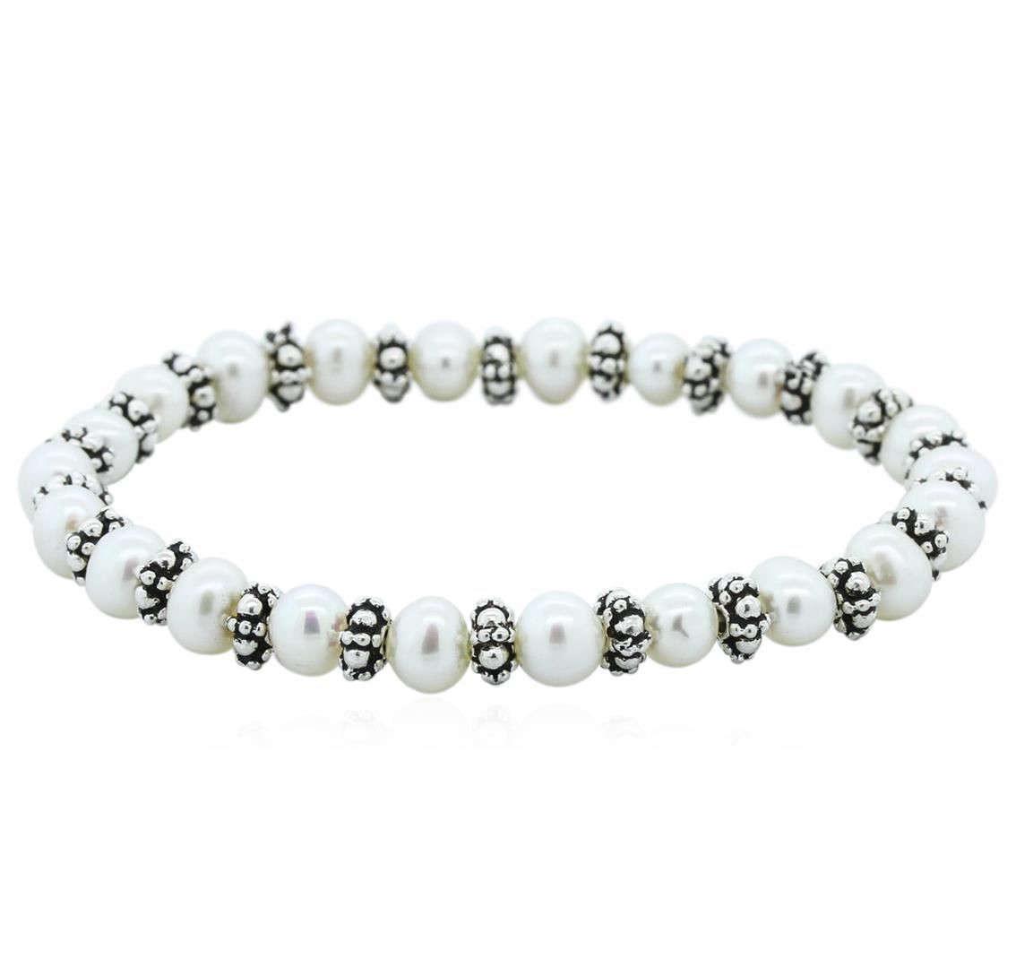 One white cultured pearl necklace, stretch bracelet that adjusts to different wrist sizes, and matching earrings. The pearls in this set measure approximately 5.5-7 mm. Good condition.