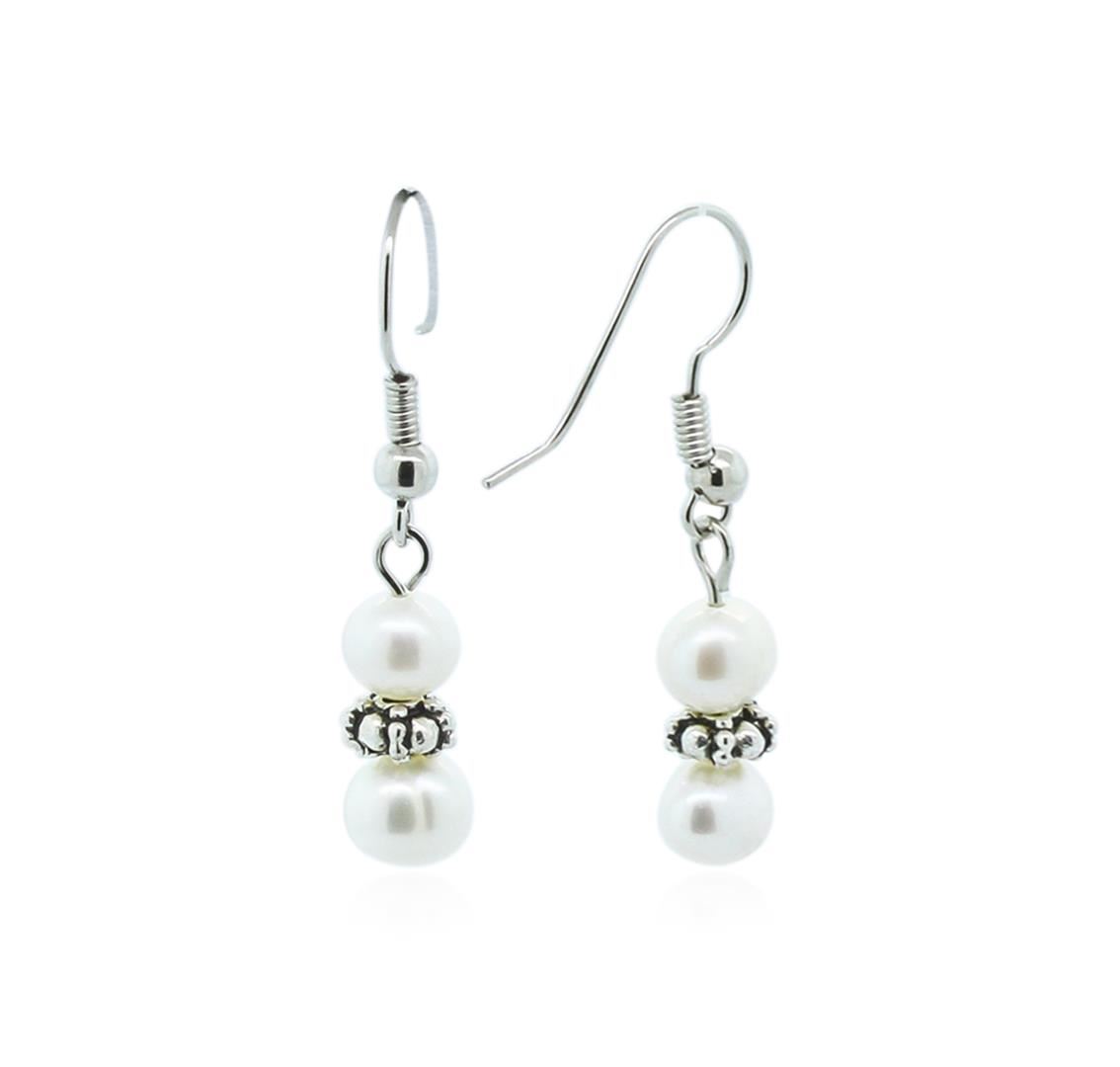 One white cultured pearl necklace, stretch bracelet that adjusts to different wrist sizes, and matching earrings. The pearls in this set measure approximately 5.5-7 mm. Good condition.
