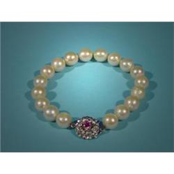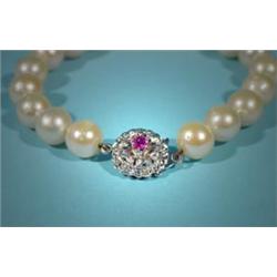 Cultured pearl bracelet, white gold clasp and ruby, 14 Kt, l. 18 cm.…