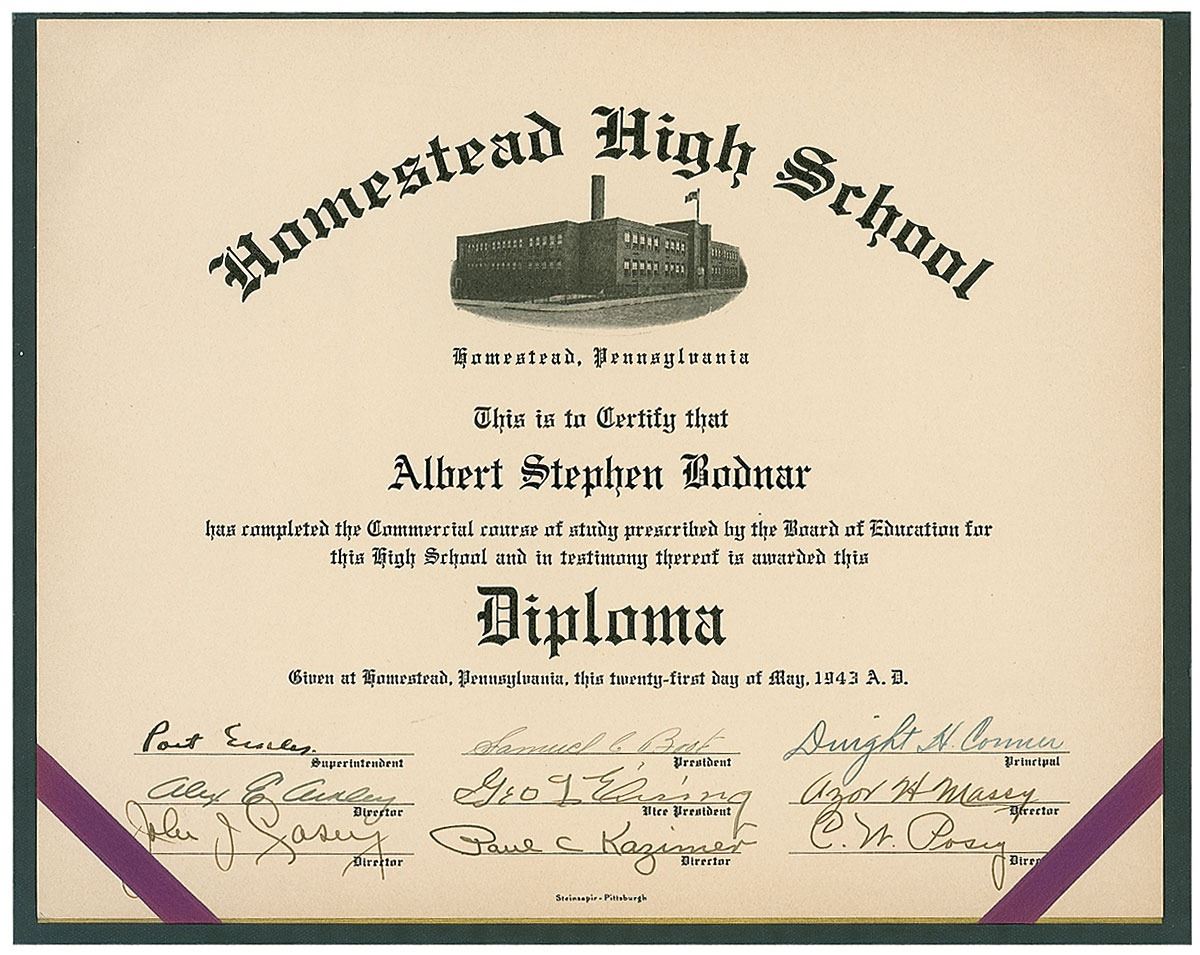 American baseball player, manager, and team owner in the Negro leagues (1890–1946) who built the Homestead Grays into one of the powerhouse teams in black baseball. Contract, signed “C. W. Posey,” one page, 10 x 8, May 21, 1943. Homestead [Pennsylvania] High School diploma issued to Albert Stephen Bodnar and signed by Posey as one of the school’s nine directors. In fine condition, with uniform light toning and a couple of faint creases. Accompanied by the original presentation folder. Posey is among the rarest of all Hall of Fame signatures.