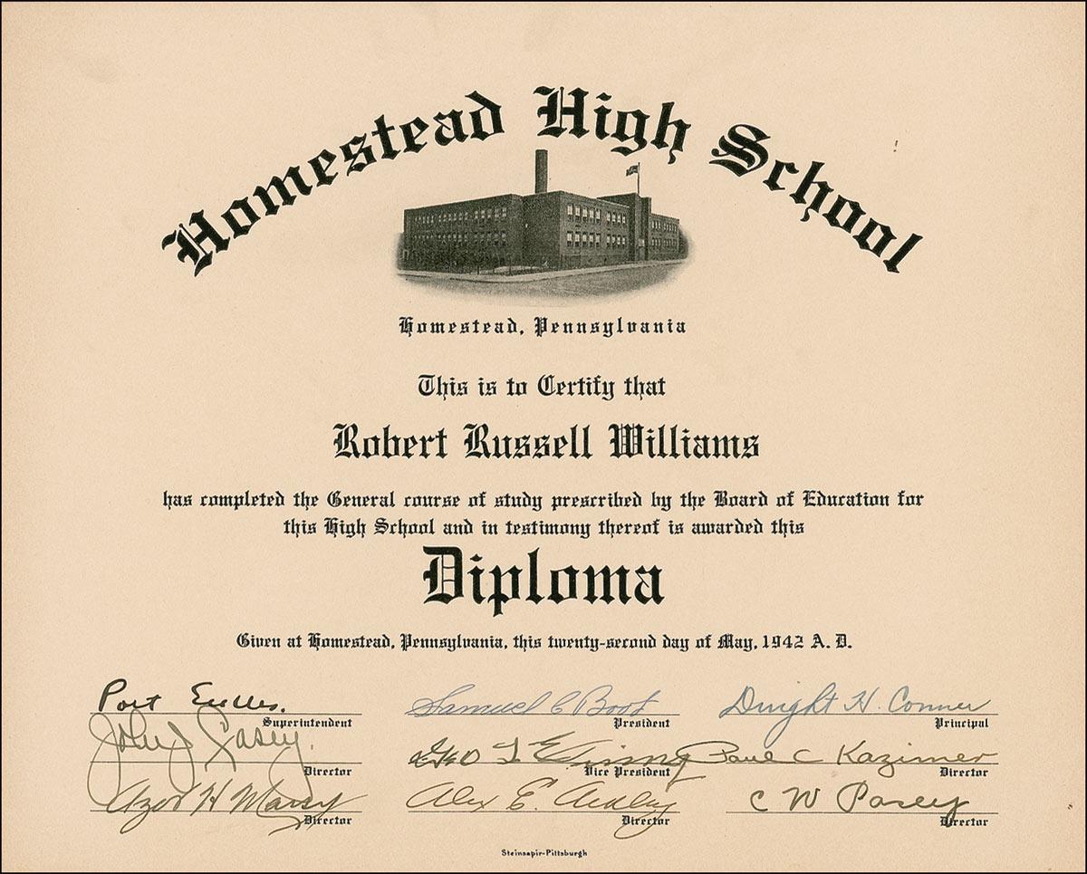 Baseball Hall of Fame player, manager, and team owner in the Negro Leagues, as well as a star professional basketball player and team owner (1890–1946). Although he died in 1946, he was not elected to the Baseball Hall of Fame until 60 years later. DS, signed “C. W. Posey,” one page, 10 x 8, May 22, 1942. Homestead [Pennsylvania] High School diploma issued to Robert Russell Williams and signed by Posey as one of the school’s directors. Also signed by eight other school officials. Very light toning and a couple of faint creases, otherwise very fine condition. Accompanied by the original presentation folder. Posey is among the rarest of all Hall of Fame signatures.