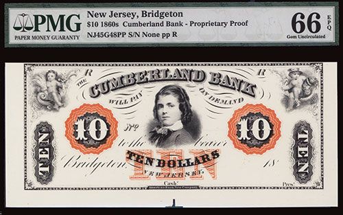 Bridgeton, New Jersey. 18xx (originally printed in 1860's, these are ca.1960-70's), $10, (NJ-45-G48PP), Modern “Proprietary Proofs”. the $10 note has cherubs on upper left and right with portrait of young man (I think) in middle. Black printing with red underprint printed on thin white card, PMG graded Gem Uncirculated 66 EPQ, ABNC.