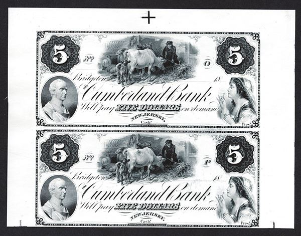 Bridgeton, New Jersey. Lot of 2 notes (uncut sheet of 4), 18xx (ca.1970's), $5-5, (NJ-45-G34), Modern "Proprietary Proofs". Portrait of marble bust of man on lower left, man feeding cows hay in middle and young woman blowing dandelion on right, Black printing without underprint and printed on thin white card, Uncirculated to Gem Uncirculated condition. ABNC. Archival "Proprietary" proofs rarely seen in sheet form.