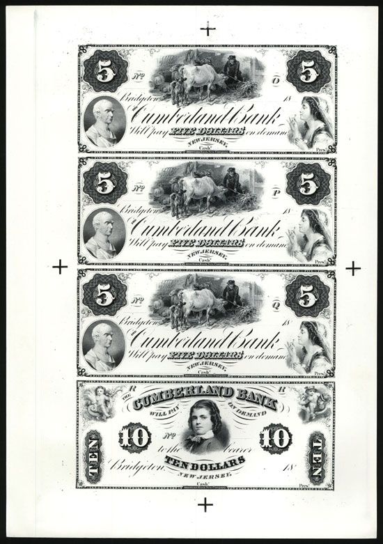 Bridgeton, New Jersey. Lot of 4 notes (uncut sheet of 4), 18xx (ca.1960-70's), $5-5-5-10, (NJ-45-G34,; G48), Modern ÒProprietary ProofsÓ. The $5 proofs have portrait of marble bust of man on lower left, man feeding cows hay in middle and young woman blowing dandelion on right; the $10 note has a farm family with chicken on lower left, farm family on raft in middle and young female reapers on lower right; the $10 note has cherubs on upper left and right with portrait of young man (I think) in middle. Black printing without underprint printed on thin white card, Uncirculated condition. ABNC. Archival ÒProprietaryÓ proofs rarely seen in sheet form. (ABN Commemoratives, AIA XI, May 15, 2012)